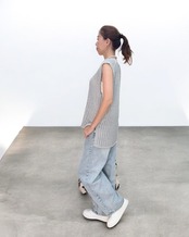 ほどよい透け感と立体的な見目が特徴のテープヤーンを使用し、夏にぴったりな涼しげな印象にしてくれるノースリーブニット。