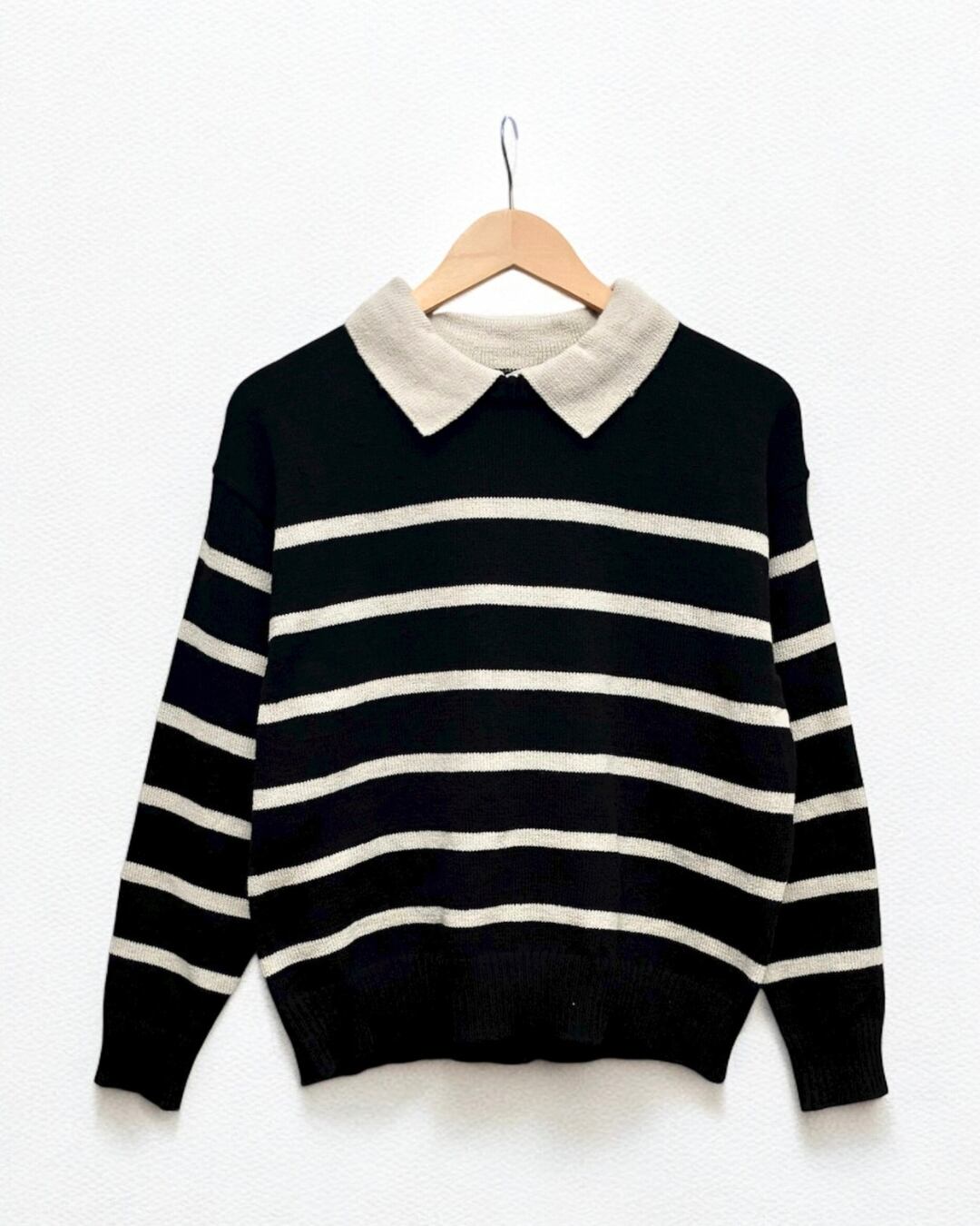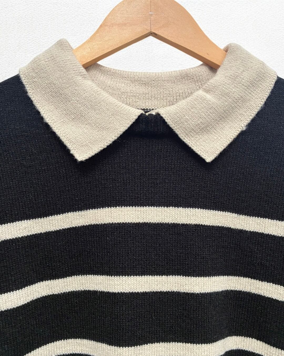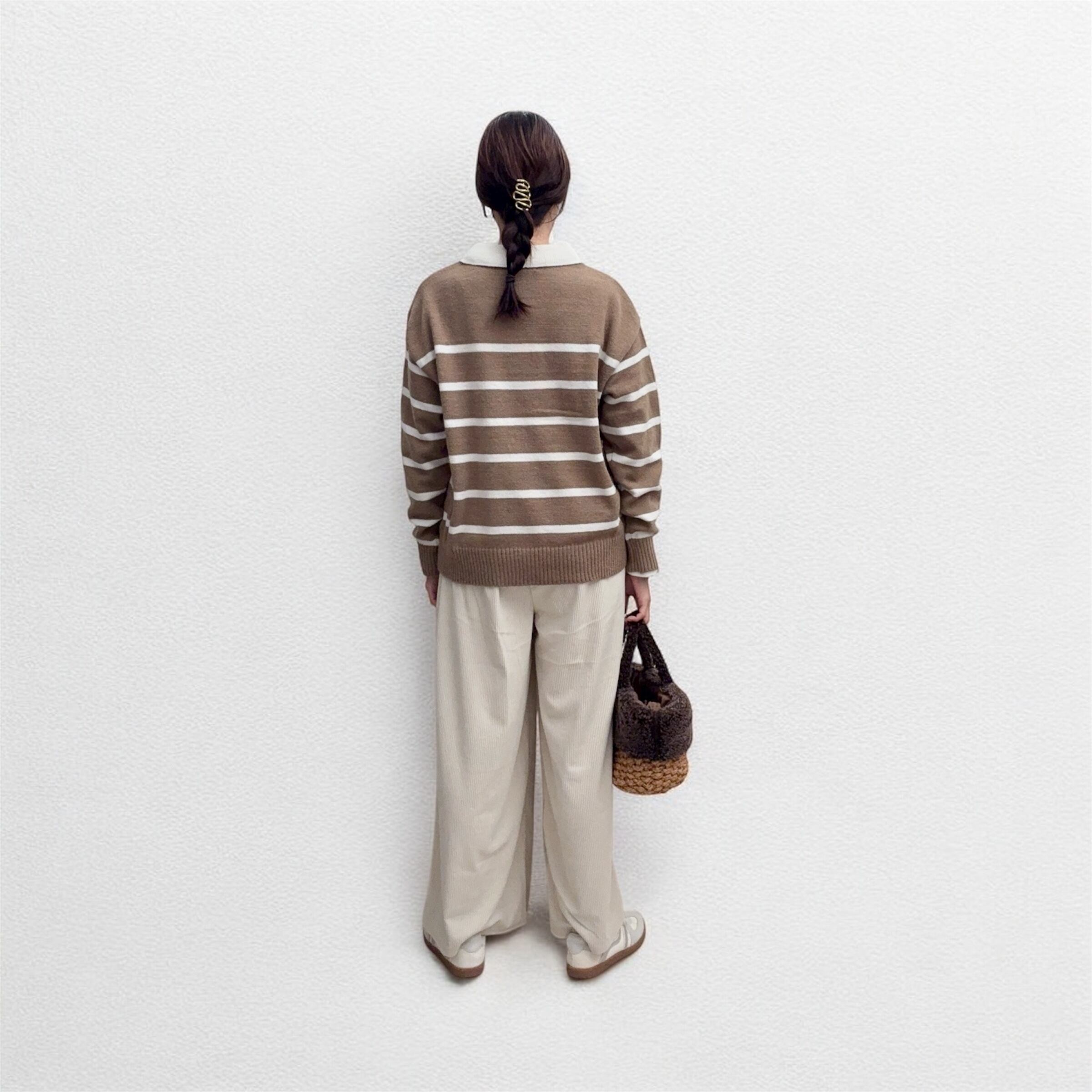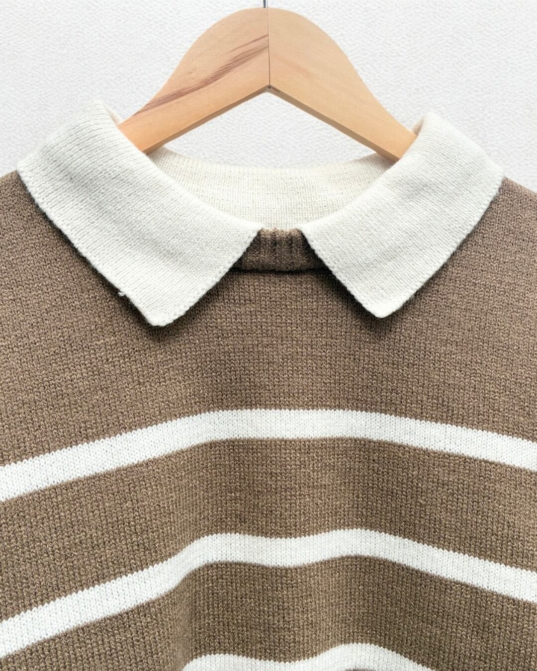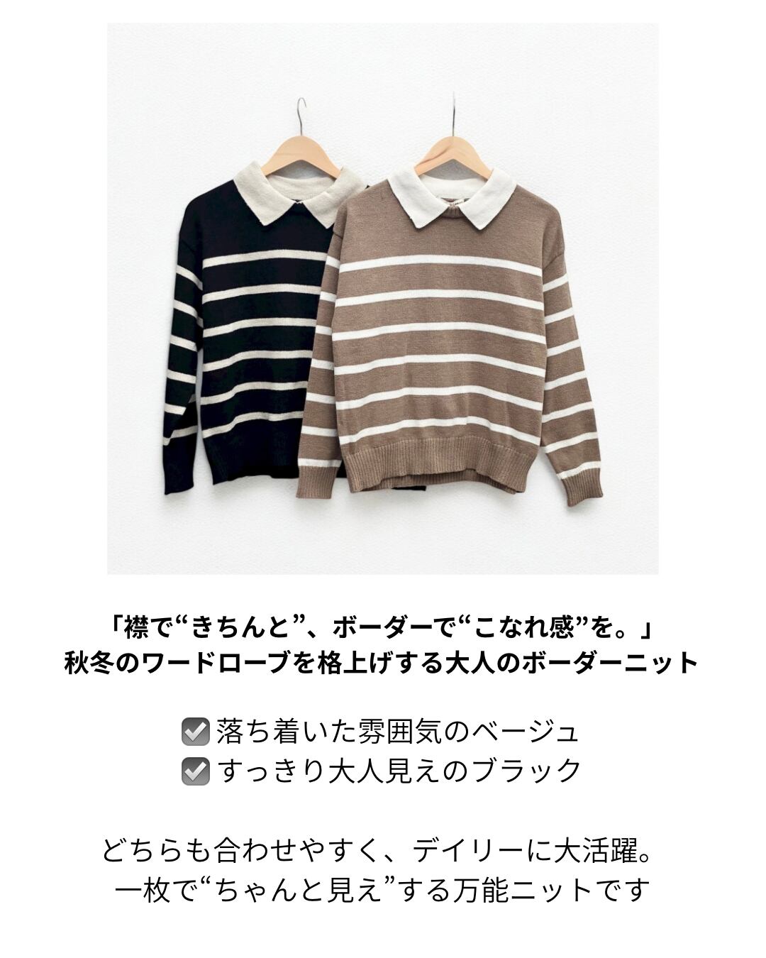 上品な配色襟が目を引く、ボーダーデザインのニットプルオーバー。
