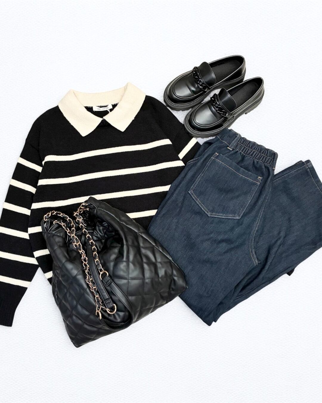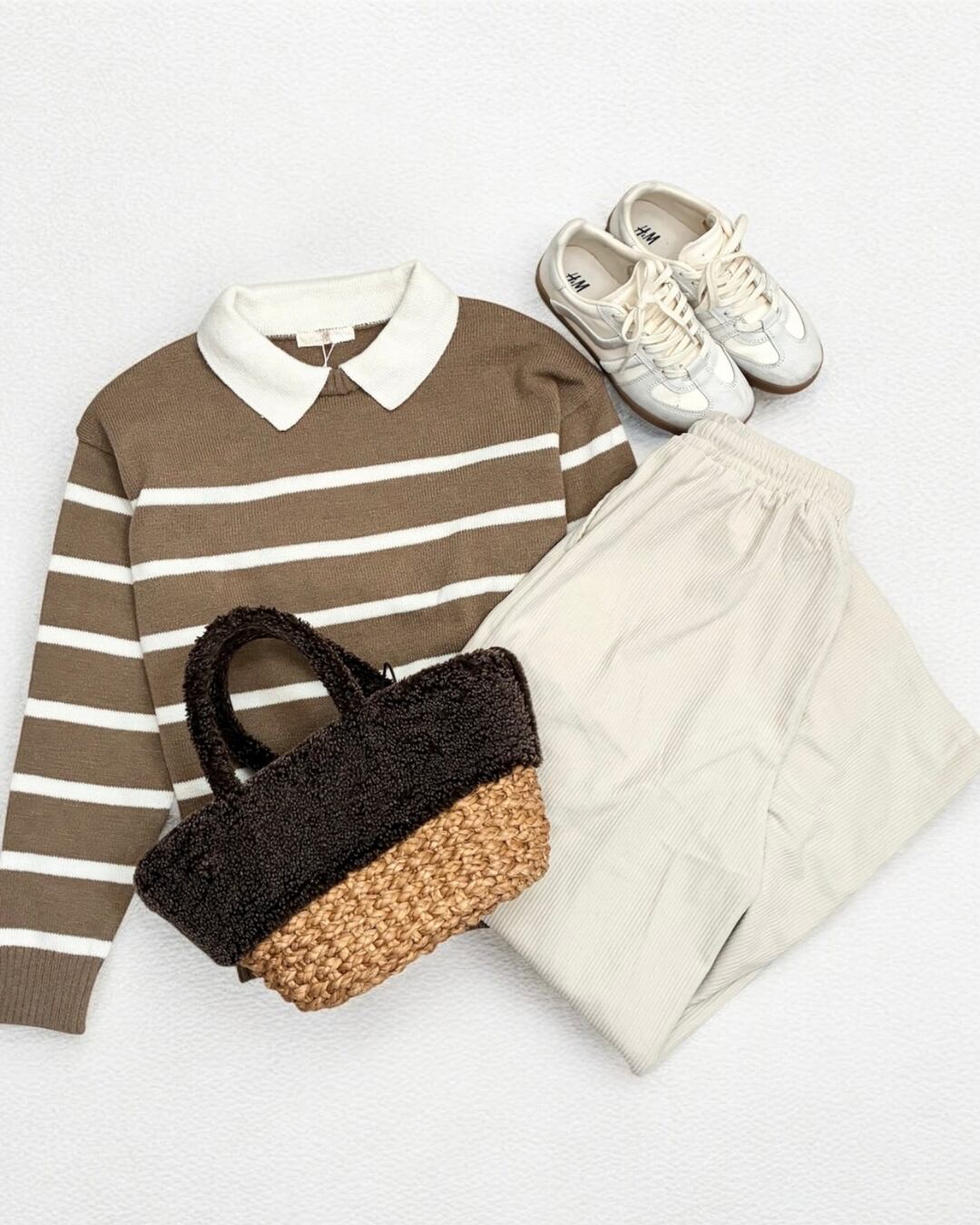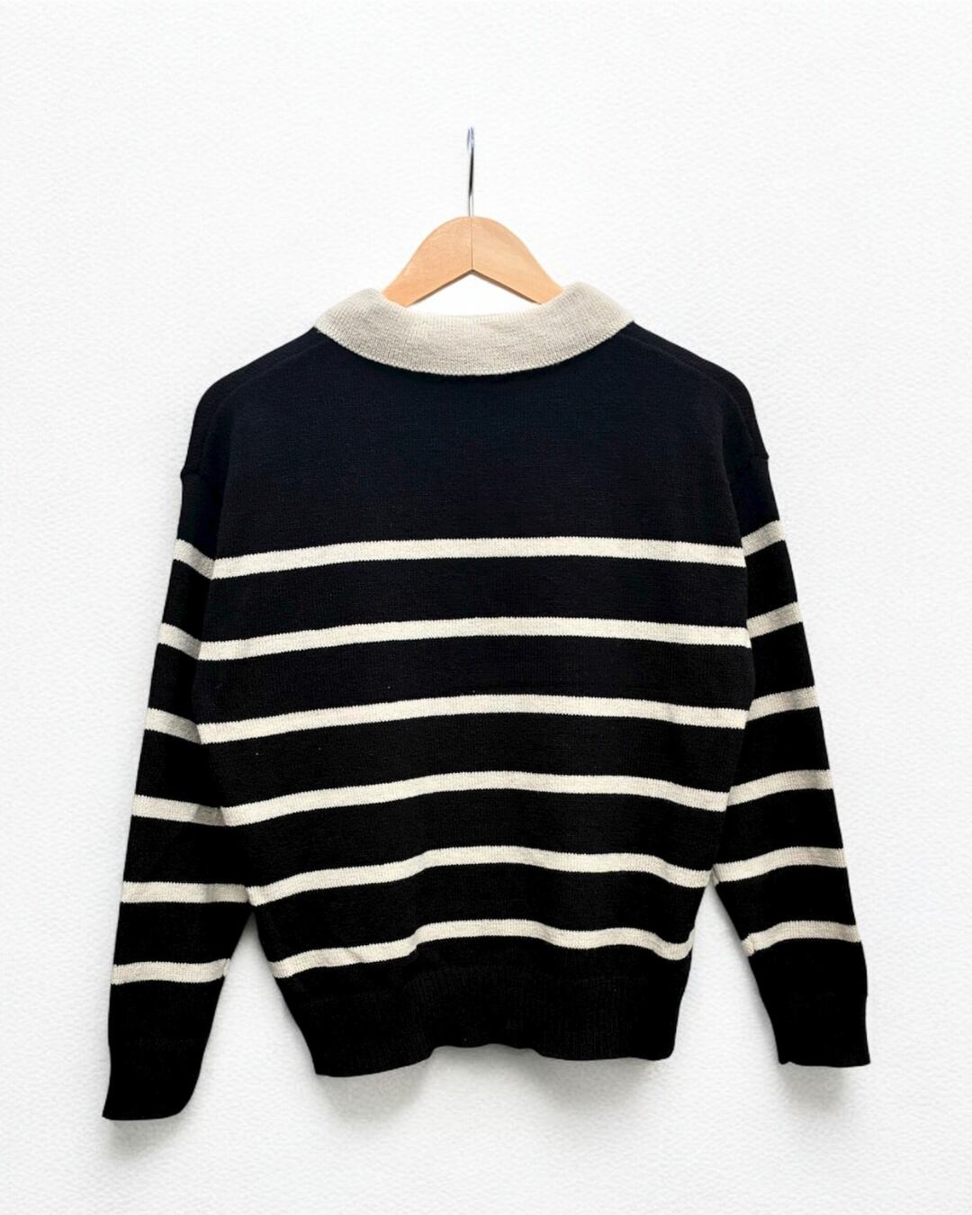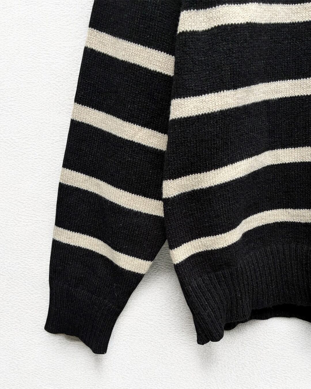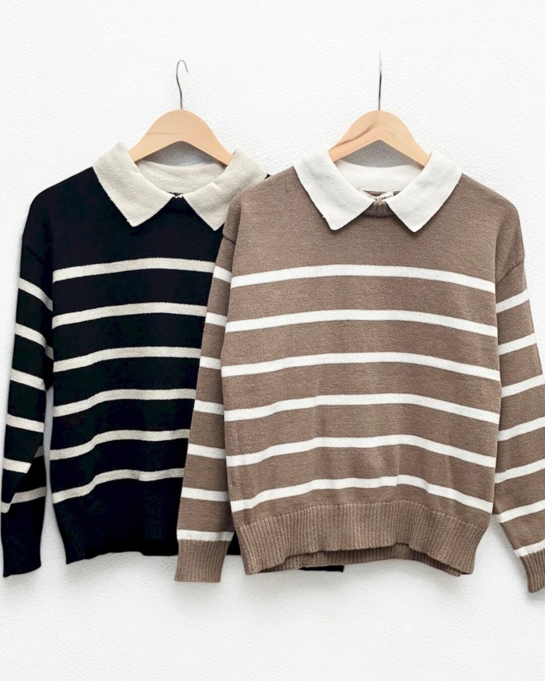 上品な配色襟が目を引く、ボーダーデザインのニットプルオーバー。