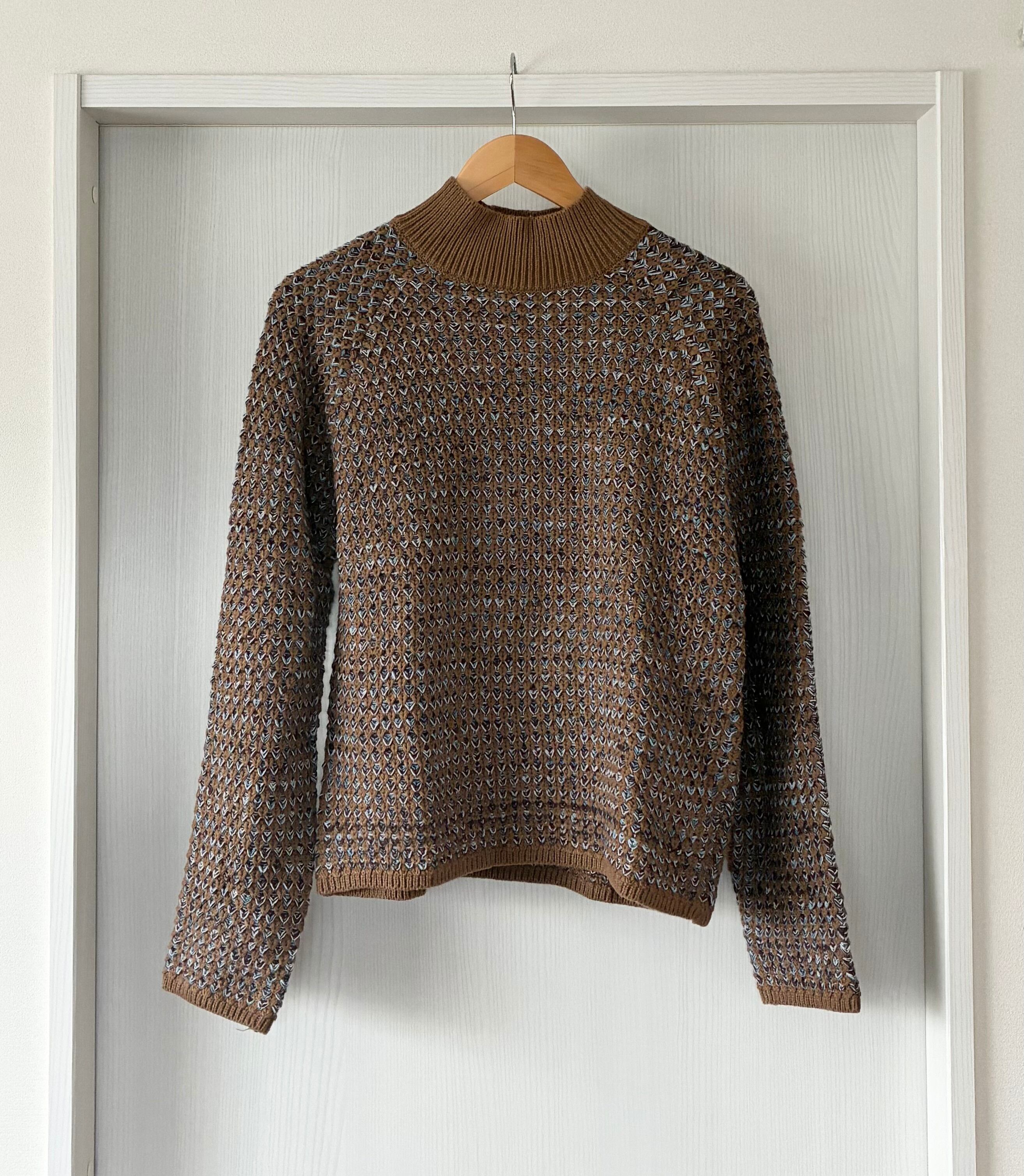 ブラウンをベースにしたミックス編みは、光の角度で表情が変わり、落ち着いた大人の雰囲気に。